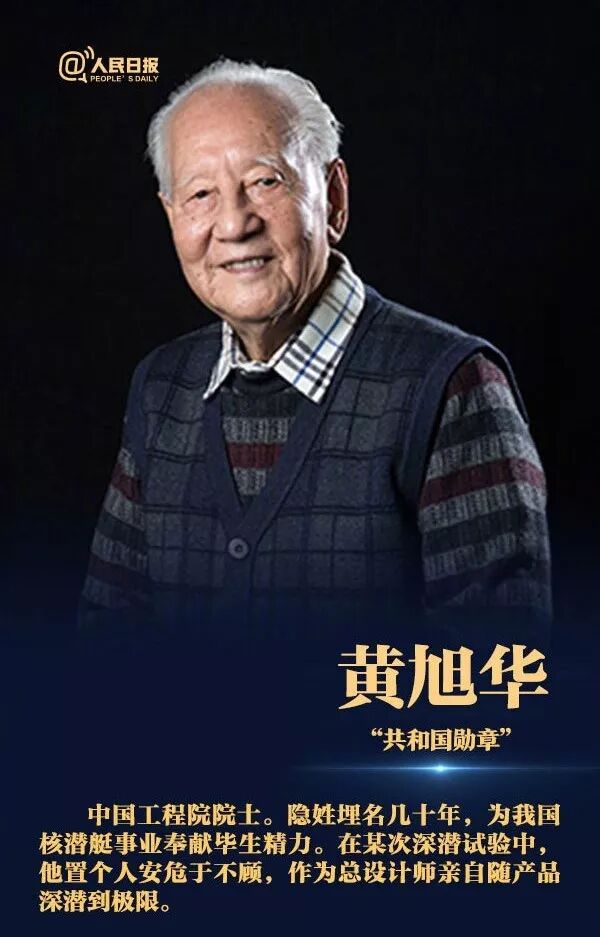 黄旭华,男,汉族,中共党员,1926年3月生,广东揭阳人,中国船舶重工集团719所名誉所长、原所长,中国工程院院士。他隐姓埋名几十年,为我国核潜艇事业奉献了毕生精力,为核潜艇研制和跨越式发展作出卓越贡献。在某次深潜试验中,他置个人安危于不顾,作为总设计师亲自随产品深潜到极限。荣获国家科学技术进步奖特等奖和“全国先进工作者”等称号。