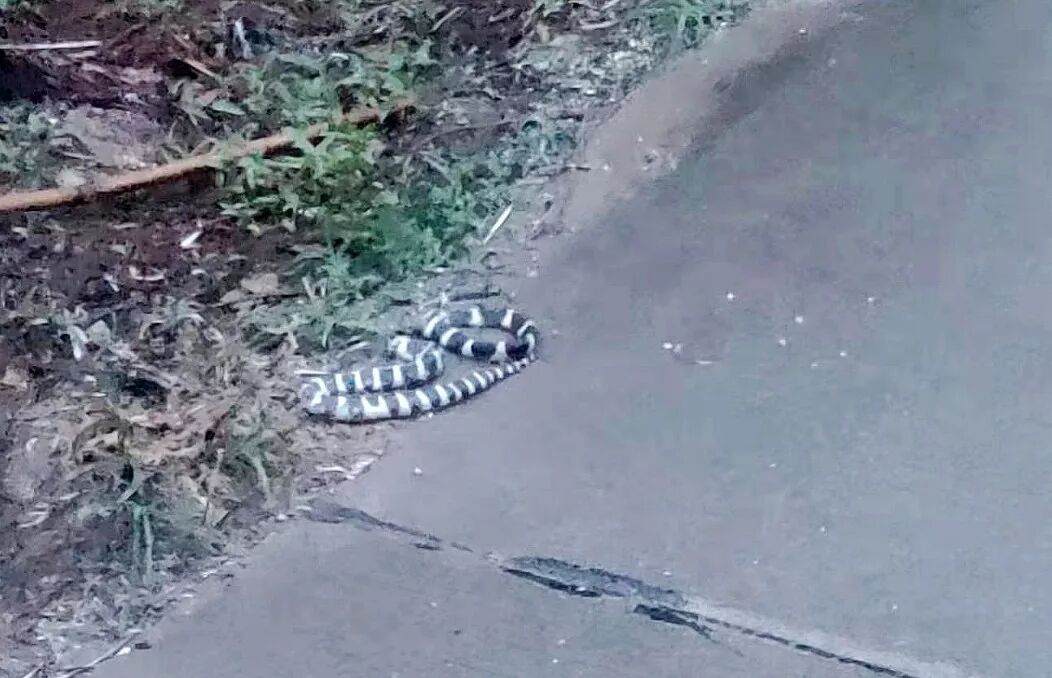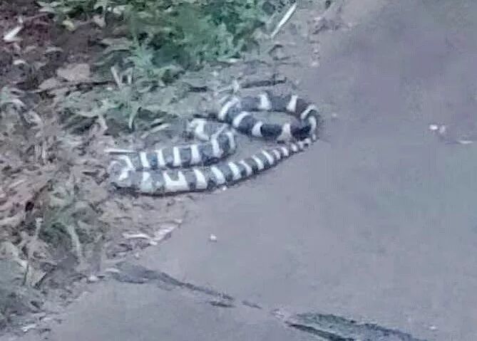 据了解,村民途径该路段时突然看见路边有个黑白色的东西,刚开始以为是条绳子,结果走近一看发现是条约1.2米的黑白蛇,村民吓得马上远离。之后村民上百度查询得知这条黑白蛇属于银环蛇,剧毒。