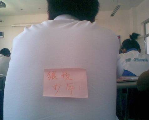 快下课时,在小纸条上写着“傻子”,然后轻轻地贴在前桌的背上,看着他不知不觉地到处走……