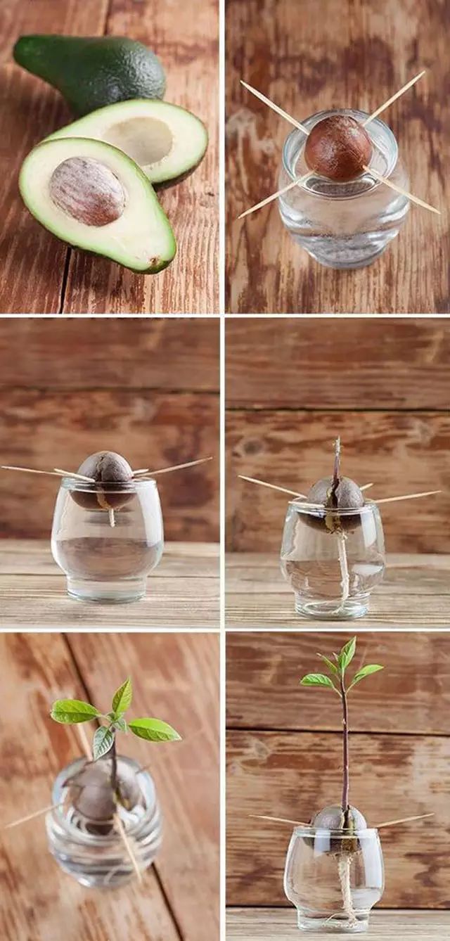 每天换水,2-3周后,就可以看到牛油果裂开,长出白色的根,抽出新芽。