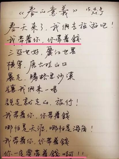 一首“小清新”诗歌在网络上走红,文风清新,与时下最热门的“说走就走的旅行”十分合拍。但是,“你一定要带着钱啊”又不失调侃意味。