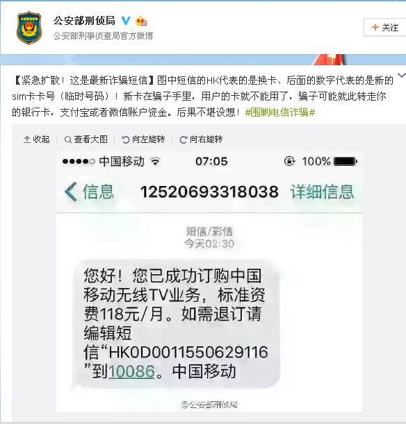 图中短信的HK代表的是换卡、后面的数字代表的是新的SIM卡卡号(临时号码)!新卡在骗子手里,用户的卡就不能用了,骗子可能就此转走你的银行卡,支付宝或者微信账户资金。后果不堪设想!