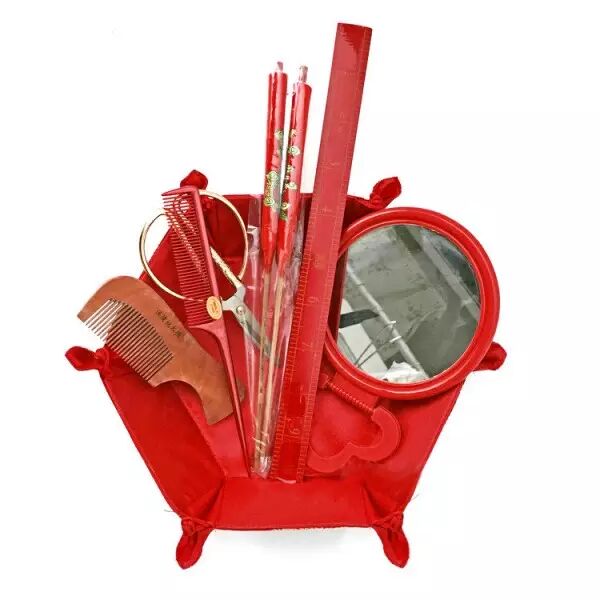 如果是同岁的夫妻,新娘还需要备上一对 “红竹筒” ,一对 “红尺” ,一对 ”剪刀” 寓意为新娘与新郎能同心同德,生活美满。