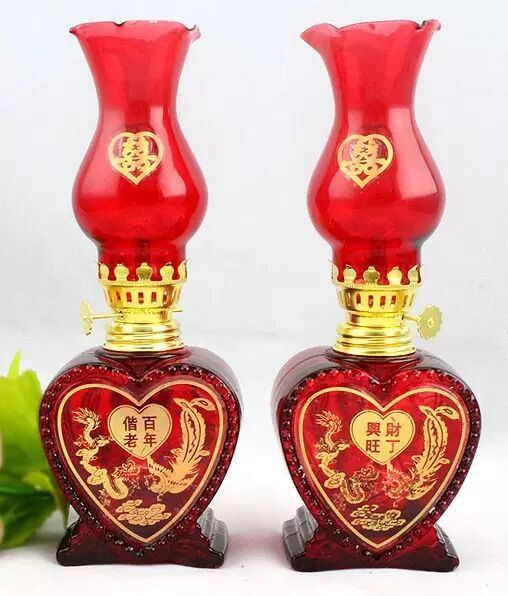 出嫁时, “油瓶” 里要倒些茶油或豆油,瓶嘴处插支红花,然后把 “油瓶“、“对灯” 一起放入 ”花篮” 里,由阿舅提着引入新郎家,寓意为新郎家添丁。