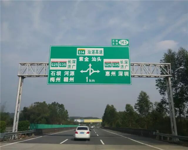 14:04分到达石坝交(至此耗时1小时44分),沿中间车道直走,往汕湛高速,紫金、汕头方向,一定要毫不犹豫的直走,因为部分导航地图,仍然显示此段是在建中,非要引导你靠右驶出高速,转省道。