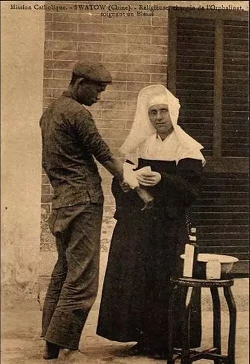 18、汕头的天主教修女在为一名伤者包扎伤口及敷药。