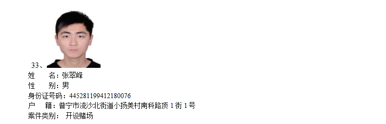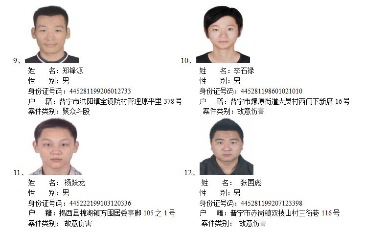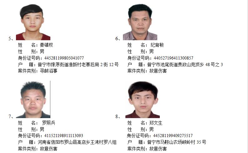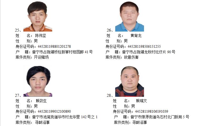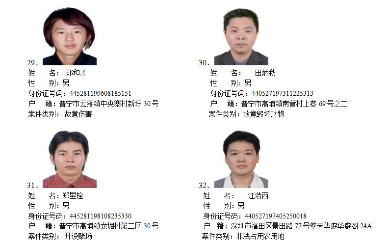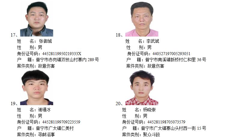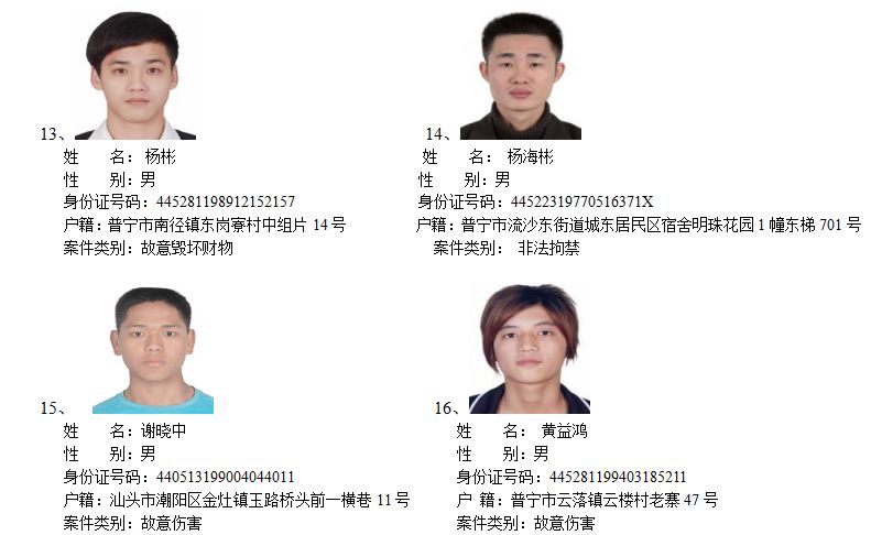 为推动扫黑除恶专项斗争和“铁网2”追逃专项行动的深入开展,普宁市公安局决定对下列负案在逃人员予以公开悬赏通缉,并敦促负案在逃人员到公安机关投案自首,争取依法从宽处理。希望广大群众积极提供在逃人员线索,凡在2018年11月25日至2018年12月15期间,提供线索并协助抓获下列在逃人员的,每抓获1名,公安机关将给予举报人人民币5000元奖励,并对举报人严格保密;对窝藏包庇在逃人员的,将依法从严追究法律责任,对打击报复举报人的,将依法从严惩处。