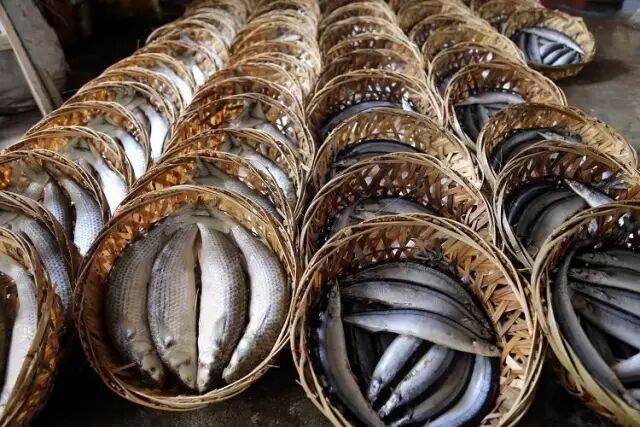 鲜鱼经打鳞劏肚去腮,洗净后用盐水浸泡,装于小竹筐中再放入大锅里用高浓度盐水煮熟,晾凉后即成鱼饭。