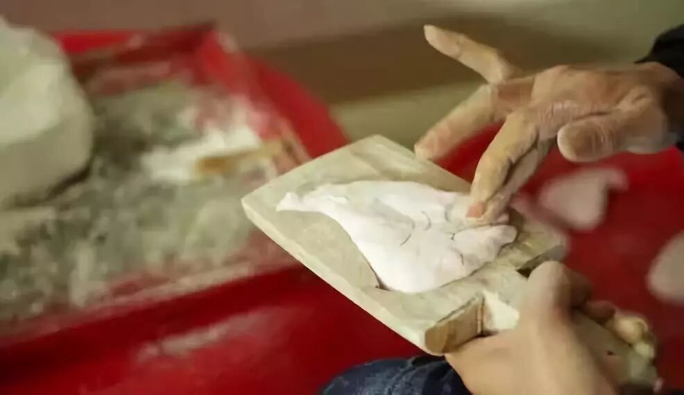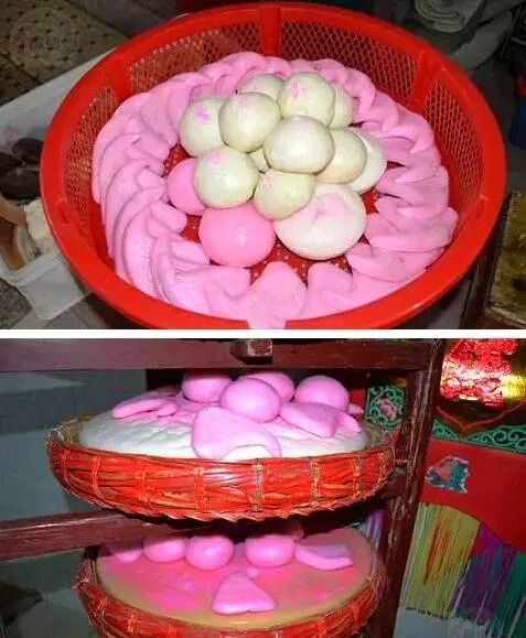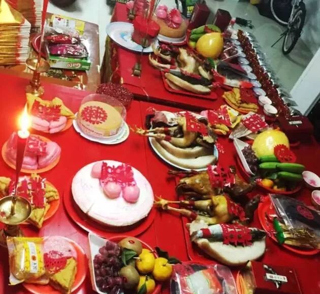 在食物上还要贴上相应图案的各类吉祥剪纸。