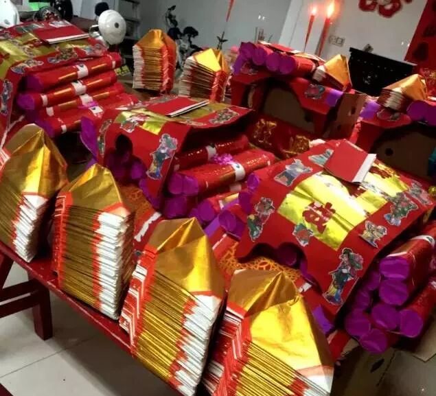 大竿钱四副(约是90cm×40cm),分别写上家门钱、平安钱、求财钱、赐福钱等;大钱对三把,每把大约有半斤,大元宝一个,贴一个、香三支、烛一对、小竿四副(写的内容和大竿钱一样)、小钱对三把、元宝一个、金司三十六个等。
