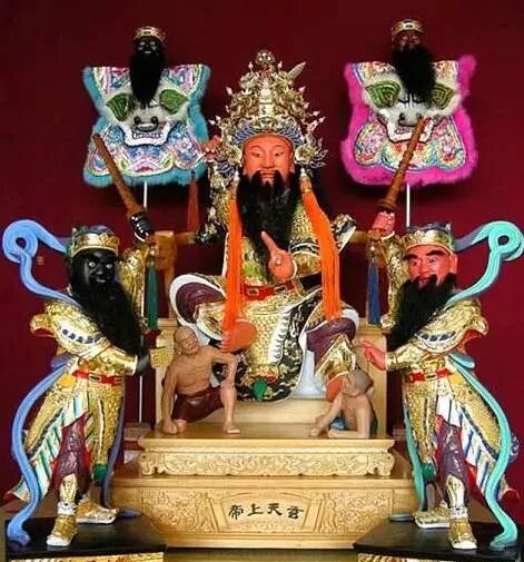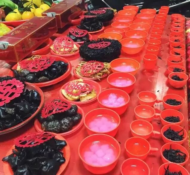 显赫的神明,如玉皇上帝(天公)的食物祭品有:鸡、鸭、猪肉、鱼、糖塔、茶、酒、针菜、香菇、木耳、最大的一份粿品等;
