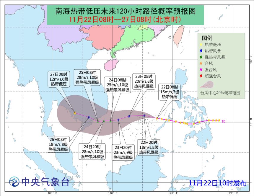 南海热带低压的中心今天(22日)上午8点钟(北京时,下同)位于越南胡志明市偏东方向约1180公里的南海东南部海面上,就是北纬10.6度、东经117.4度,中心附近最大风力7级(15米/秒),中心最低气压1002百帕。