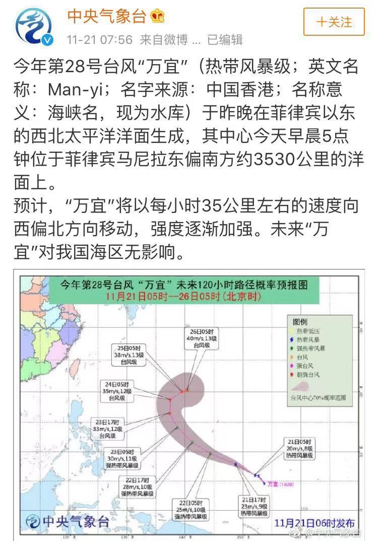 另外,今年第28号台风“万宜”(强热带风暴级)的中心今天上午8点钟位于菲律宾马尼拉偏东方约2290公里的西北太平洋洋面上,就是北纬10.5度、东经141.7度,中心附近最大风力10级(28米/秒),中心最低气压982百帕,七级风圈半径180-240公里,十级风圈半径40-60公里。