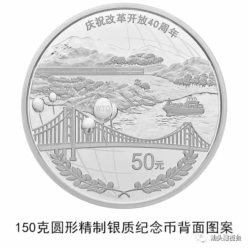150克圆形银质纪念币背面图案为象征“一带一路”的陆地、海洋、桥梁、橄榄枝等装饰组合设计,并刊“庆祝改革开放40周年”字样及面额。