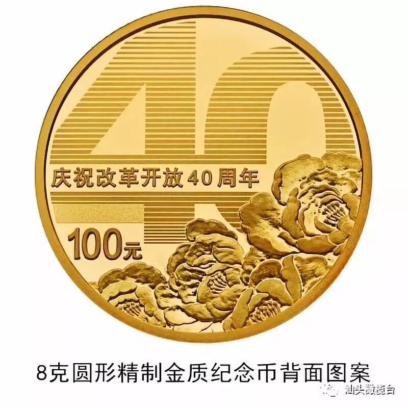 8克圆形金质纪念币背面图案为数字“40”造型与牡丹花组合设计,并刊“庆祝改革开放40周年”字样及面额。