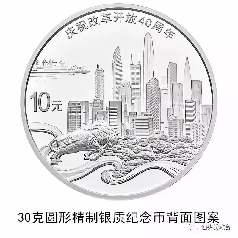 30克圆形银质纪念币背面图案之二为深圳城市建筑、蛇口港、拓荒牛雕塑及飘带等组合设计,并刊“庆祝改革开放40周年”字样及面额。