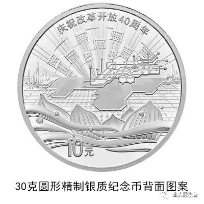 30克圆形银质纪念币背面图案之三为上海浦东标志性建筑及南浦大桥、黄浦江等组合设计,并刊“庆祝改革开放40周年”字样及面额。