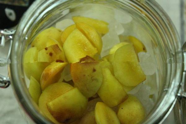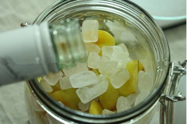 7.倒入朗姆酒(白酒或清酒),盖上瓶盖,将装有青梅酒的玻璃瓶移至阴凉处即可。