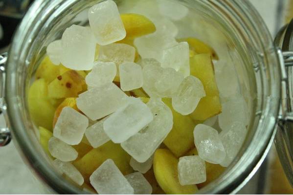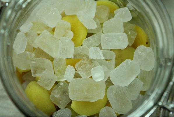 6.铺一层梅子果肉于冰糖之上,再铺一层冰糖,依次类推,重复此动作至瓶子九分满。