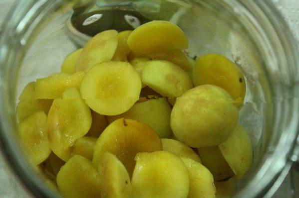 5将梅子果肉铺一层于玻璃瓶底,并在果肉上撒一层冰糖