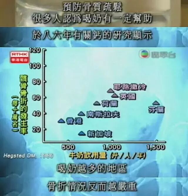 哈佛大学公共健康学院的Dr. Walter Willet 的研究发现,喝牛奶对预防骨折未必有帮助。喝牛奶越多的地区,骨折情况反而愈严重。