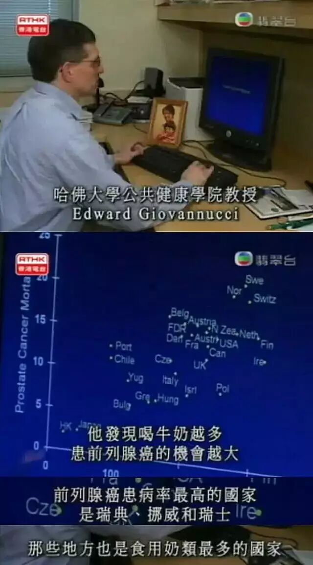 哈佛大学公共健康学院的Dr. Edward Giovannucci 发现,牛奶摄取量愈高的国家,患上前列腺癌的比率就愈高,指出这很可能与牛奶里的过量钙质有关。