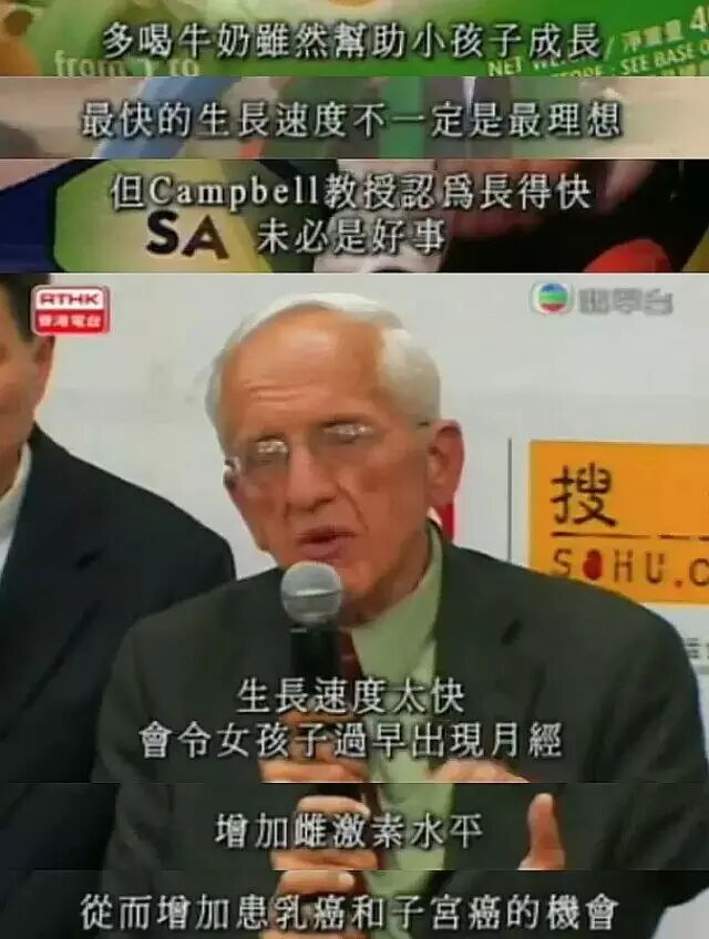 Dr.T. Colin Campbell表示,牛奶确会令孩子长快,但成年后患癌及有骨折的机会亦愈大。