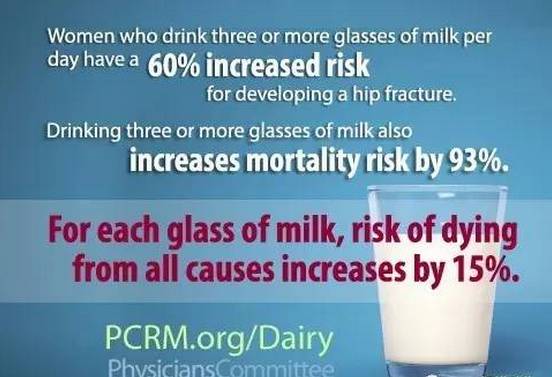 美国责任医师协会:每天饮用3杯或以上牛奶的女性,髋部骨折几率增高60%,死亡率也增高了93%。所以每一杯牛奶都会令您死于所有疾病的概率上升15%。