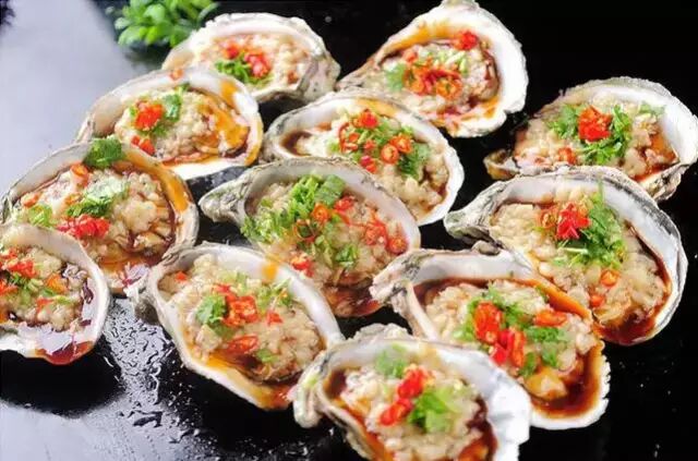 用新鲜生蚝通过炭烤而成,做法非常简单,将蒜蓉、姜末、酱等佐料放入刚刚撬开的生蚝内,再直接放到火上烤熟即可,最大限度地保证了蚝肉的新鲜还增加了蚝的野味。