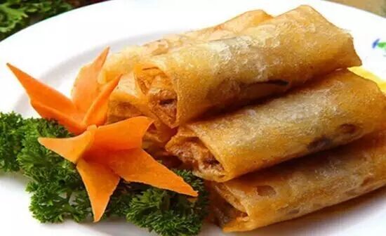 由豆腐膜包马蹄、肉沫、香菇、鲜虾等馅料,卷成长条,切成小段后入油锅煎炸,皮薄香脆、馅鲜饱满、余味无穷。