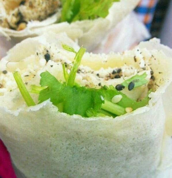 春饼是潮州传统名小吃,外皮酥脆、馅料浓香。加入了猪肉、鲜虾肉、香茹、虾米、蒜茸,和用鱼露、味精、胡椒粉、麻油、猪油搅拌均匀的绿豆瓣,十分美味。
