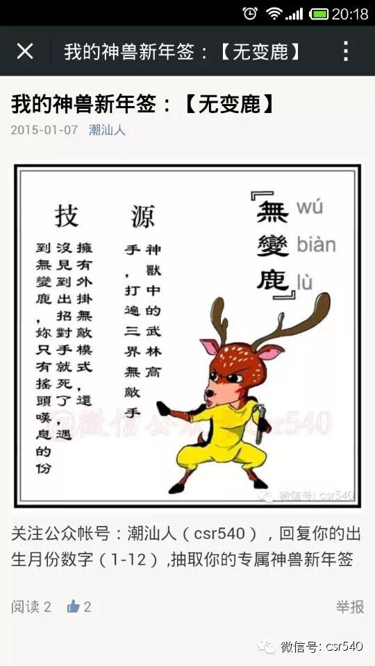只要关注潮汕人(csr540),回复您的生日月份(1-12),召唤专属于你的神兽新年签吧!