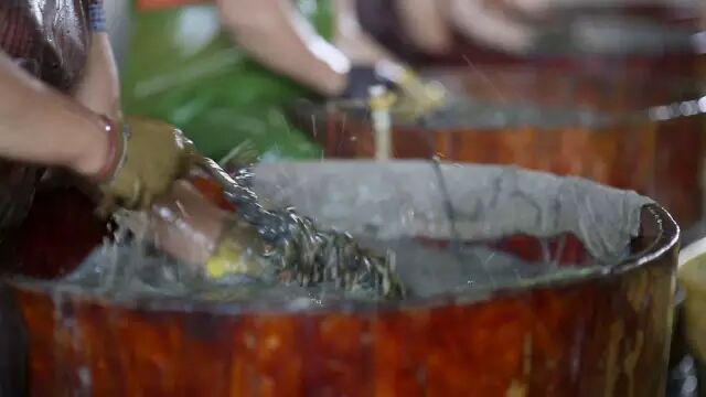 把薄壳脱壳成米延用的是流传百年的传统加工方式,整个潮汕地区只有澄海盐鸿有这种传统,用竹制曲尺形的工具——“薄壳绞”,通过搅拌让薄壳脱落去丝。