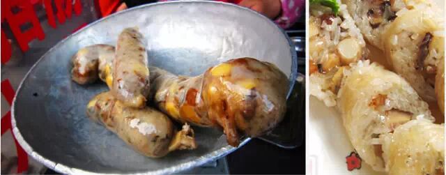 这是一种很特别的粽子,用来果腹极佳,味道有甜、咸两种馅料,里面的用料多到令人咋舌,光咸味的肉馅就有经腌制的南乳五花肉、香菇、虾米、腊肠、栗子、莲子等原料组合而成。