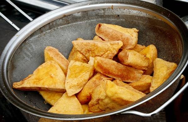 潮汕人喜欢吃普宁产的豆干,吃法有煎、焗、炸这三种,炸豆干是最受大众欢迎的,而且是一定要蘸着辣酱咸卤汁吃哦。