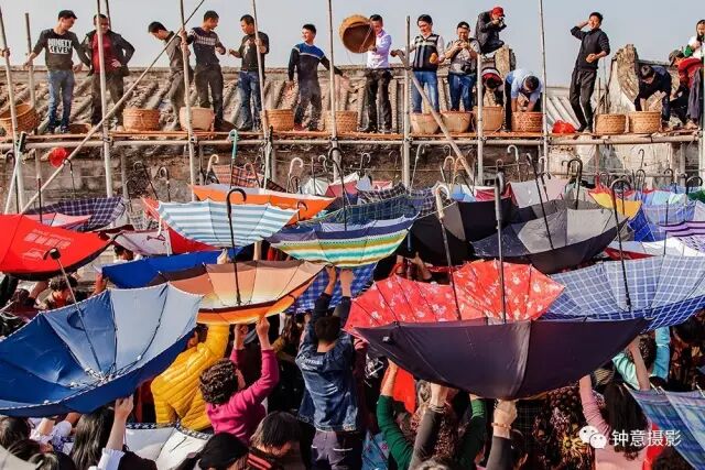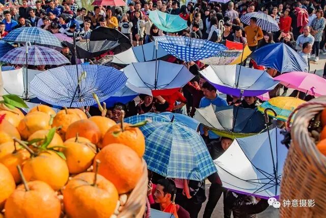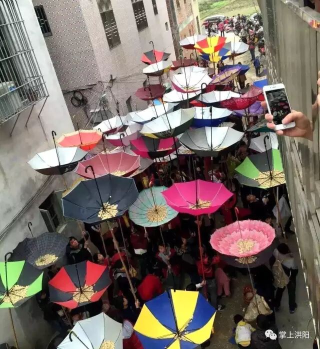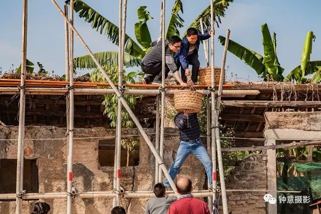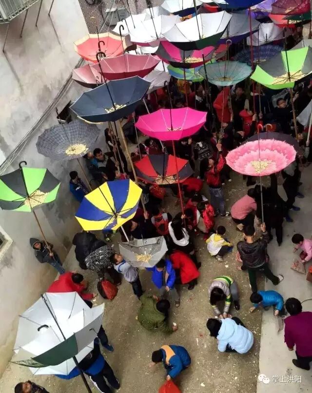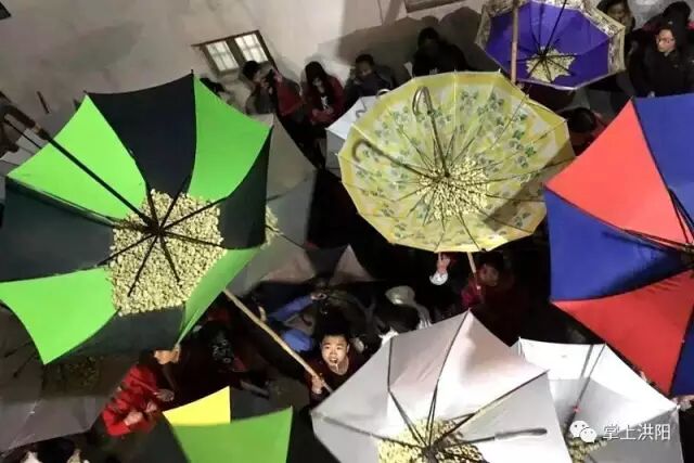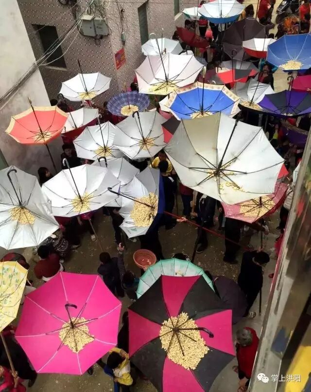 经过一番祭拜仪式,新婚和添丁的男青年就站在屋顶的竹架上向旷埕的村民撒花生和大桔,村民们纷纷举起雨伞来接,五彩缤纷的雨伞在日光下光彩夺目,场面十分壮观。