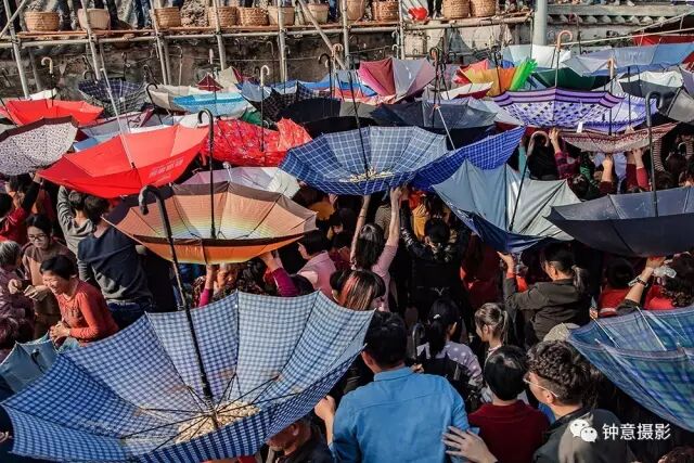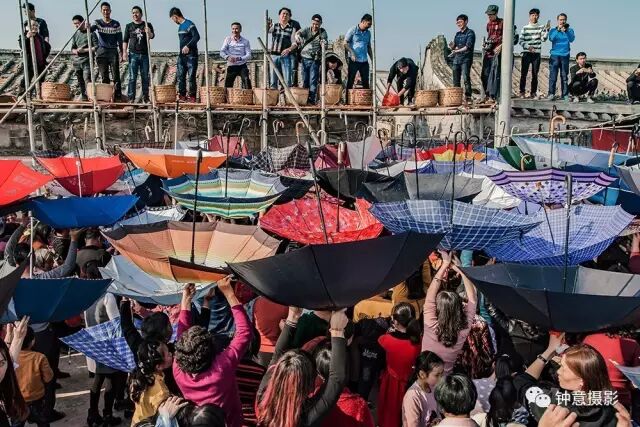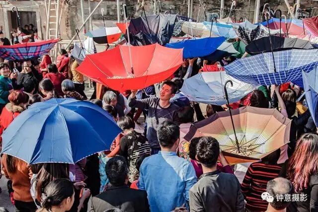 天上下起了花生雨,村民们纷纷举起雨伞。