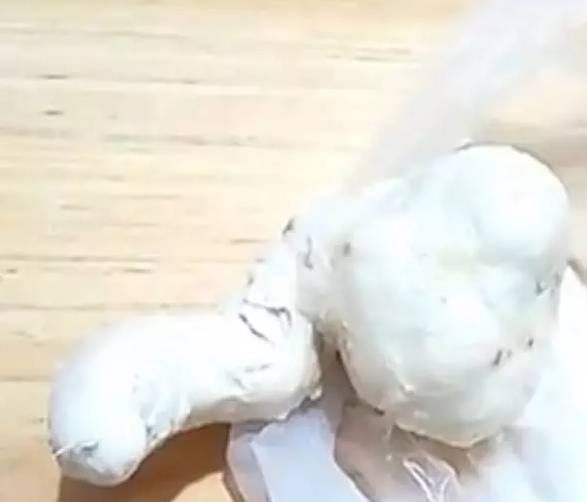 可以看到,该异物外表呈现乳白色,样子有点喜感,网友还称这东西捏起来的手感软软的,形状酷似男性生殖器。