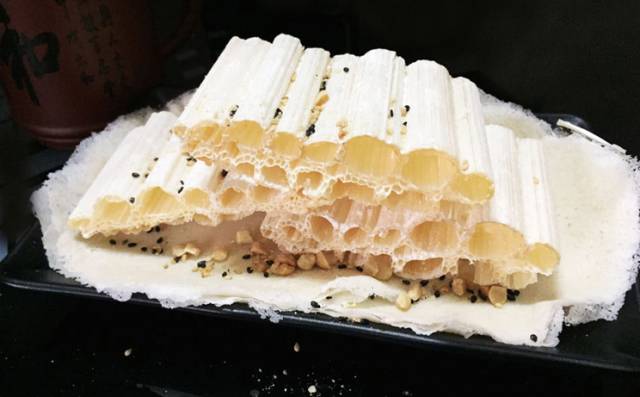 糖葱薄饼是具有潮汕独特风味的小吃,把三张薄饼叠摆成品字形,中间放两块糖葱,洒上碎花生米黑白芝麻加上一根香菜,包起来,就是美味可口的糖葱薄饼了。其口味酥脆香甜、入口即溶,令人回味无穷。