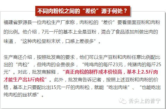 福建省罗源县某食品有限公司的一名生产商告诉记者,肉松是由鸡肉、猪肉或牛肉等肉类除去水分后制成的粉末,但肉粉松则是由豌豆粉混合了部分肉粉等制成,两者的制作成本和营养价值差距较大。“添加豆粉越多就越便宜,