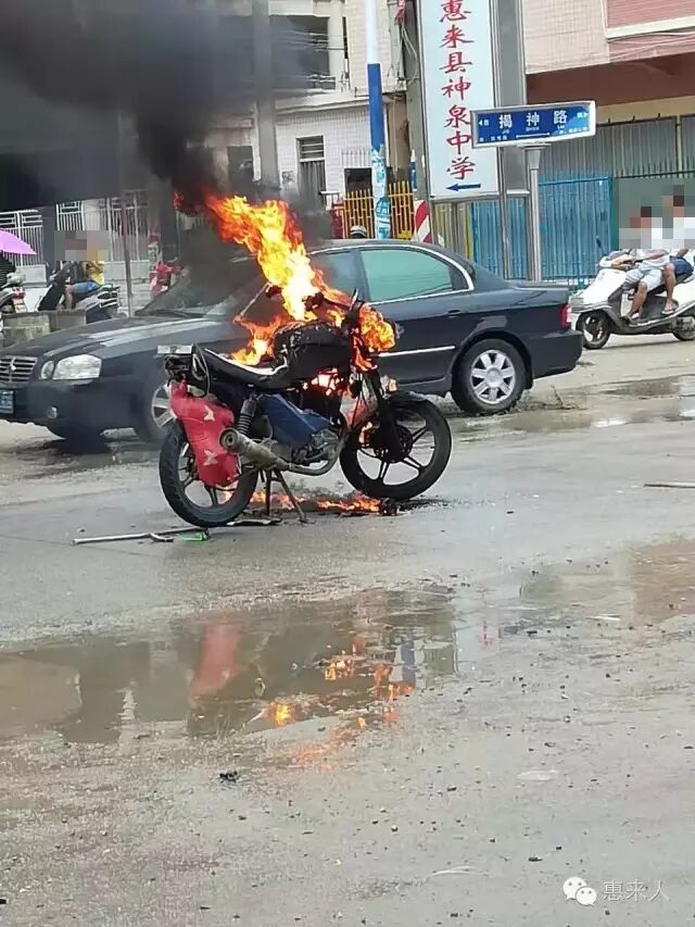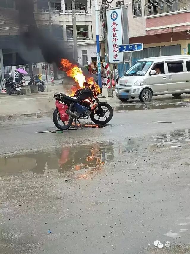事件: 今天中午,在惠来县神泉镇农信银行附近,一辆男装摩托车起火,最后摩托车被烧成一具铁壳子。