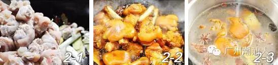第2步:等闻到香味的时候倒入猪蹄。这时加入料酒去腥味,然后加入生抽、老抽和冰糖。现在要不停的翻炒,火也要调为中火,因为冰糖融化的时候可能会糊。炒约5分钟的时候就可以看见猪蹄外面包裹了一层亮亮的漂亮的酱色,猪蹄上色就OK了。转移到烧锅中,加入没过猪蹄的水。
