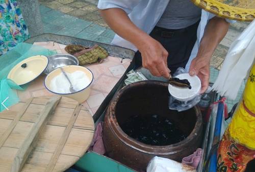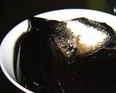 草粿是潮汕人特别喜爱的小吃,它是用草粿草清洗后水煎滤汁去渣,将液汁按比例拌加适量地瓜粉,经充分搅拌均匀,加热煮滚之后盛于陶钵瓷虹,冷凝成膏状,黑色晶莹的解暑小吃。