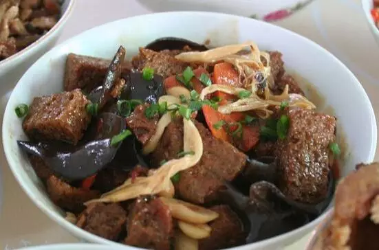 3.黑木耳、黄花菜,用水发好,洗净切段,胡萝卜切片,烤麸切小方块。