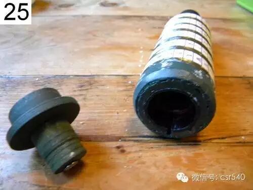 ● 我给它们上好了色,但你们请别这样做——之后的操作会把颜色弄掉,你还得返工。对了,注意那个用黄框圈住的圆柱,也是我用电磨弄的,它得刚好和最小的1号管大小相称。看看之后的步骤你就知道它有什么用了。