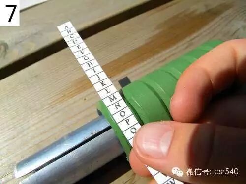 ● 你现在可以设定你的密码了——弄点儿胶水把字母条粘在环上,并使你密码的字母在一条直线上就好。
