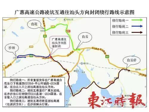 往汕头方向所有重型货车需在广惠高速白花出口下高速,接着绕行356省道-惠东平山环城路-324国道,最后在白云入口上深汕高速再往汕头方向。