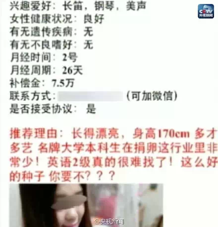 “她一点都不漂亮,又没双眼皮,耳朵又小。最好是这个,但她唯一缺点, 下巴有点往上兜。”在广州的一家代孕中介,记者看到六七个女孩在接受一对夫妇的挑选,看五官,量身高,听谈吐,像严格挑选商品一般。高三女生“捐”卵竟为还信用卡为了赚钱,年轻女孩不惜出卖自己的卵子,代孕妈妈不惜“出借”自己的 肚子。表面上看她们在用自己的身体器官和需要孩子的客户进行着“一个愿打、 一个愿挨”的交易,而记者经过深入调查发现,代孕中介很可能在这交易中布下陷阱。