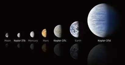 从左至右依次为月亮、开普勒-37b、水星、火星、开普勒-37c、地球和开普勒-37d。