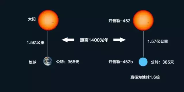 开普勒-452b位于天鹅座,距离地球1400光年,绕着一颗与太阳非常相似的恒星运行。这颗恒星开普勒-452有60亿年历史,比太阳“古老”15亿年,其质量比太阳多4%,直径比太阳多10%,亮度则要多出20%。